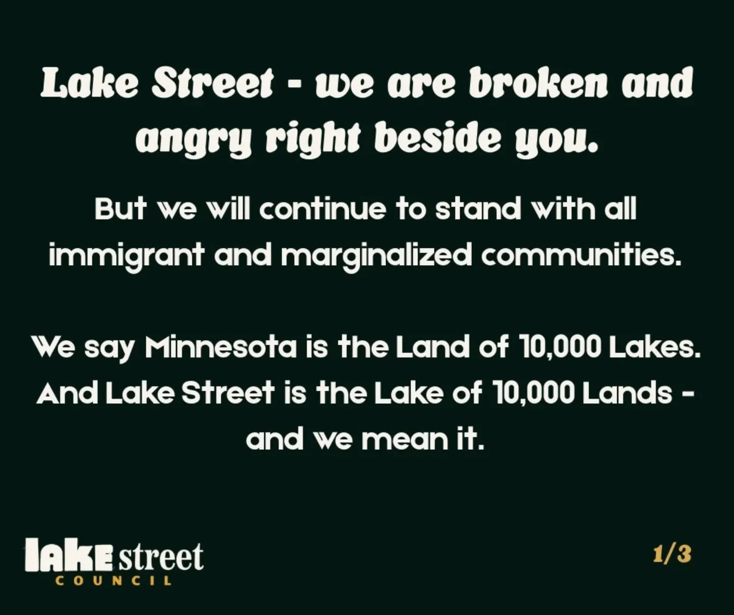 Lake Street is the Lake of 10,000 Lands - join us in supporting all immigrant and marginalized communities. Engage with the resources below and follow us on social media @VisitLakeStreet for more real-time updates.