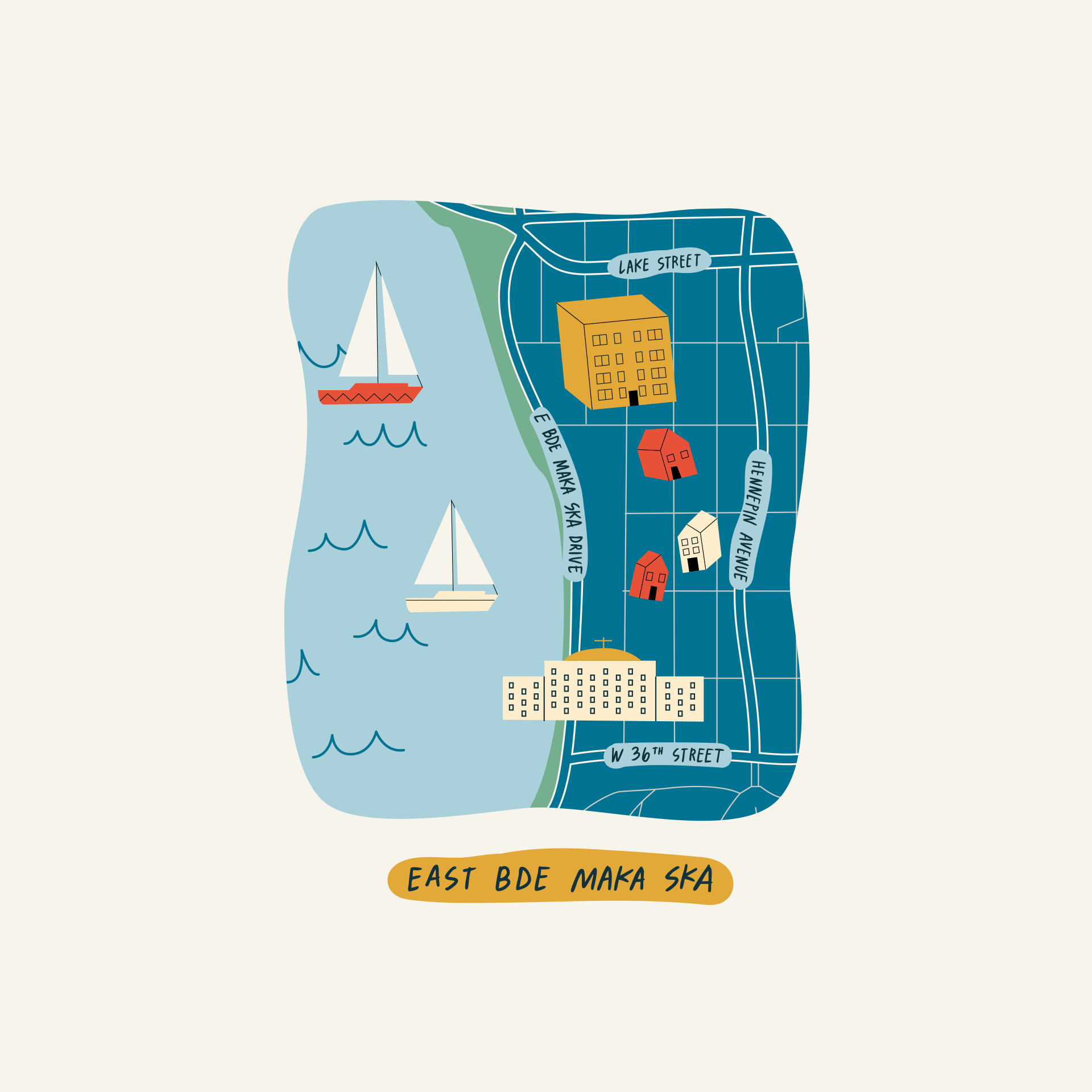 Named after Bde Maka Ska—a Dakota name meaning White Earth Lake or White Bank Lake—the East Bde Maka Ska neighborhood was once home to the Dakota agricultural village known as Ḣeyate Otuŋwe, founded by Dakota leader Mahpiya Wicasta (Cloud Man). The neighborhood continues to carry forward a practice of return and renewal, honoring the land and water to which it owes its name. From almost any corner in East Bde Maka Ska, the glimmer of the lake can be seen in the distance, a reminder that no community is static: like the lake itself, the neighborhood is constantly changing, growing, holding, and spilling forth. The neighborhood is anchored by longtime institutions like Magers & Quinn, the largest independent bookstore in the state, and Perennial Cycle, where generations of families have returned to purchase their first bicycles. As the neighborhood has faced cycles of departure and disinvestment along the corridors of Hennepin Avenue and Lake Street, neighbors have worked to build a more regenerative economy, supporting community-led small businesses as they bloom. At Queermunity, local organizations host events and neighbors gather to co-work and collaborate; across the neighborhood, new businesses like Moona Moono and Mosaic Coffee build opportunities for connection; and at the corner of Hennepin and 32nd Street, impulse juice co. and Black Walnut Bakery fill with neighborhood regulars on weekend mornings. The lakeshore serves as a gathering place for the many communities that call East Bde Maka Ska home, from bikers to paddleboarders, new arrivals to lifelong residents, renters to homeowners. Even in the darkest days of winter, folks can be found gathering along the edge of the lake to watch the sun as it sets along the western shoreline, waiting until the last light melts across the water before returning home—goodbyes turning to see-you-laters as strangers become neighbors. It is moments like these that capture the heart of East Mde Maka Ska: always a new day to come, always an old day to honor; a neighborhood built through collective imagination.