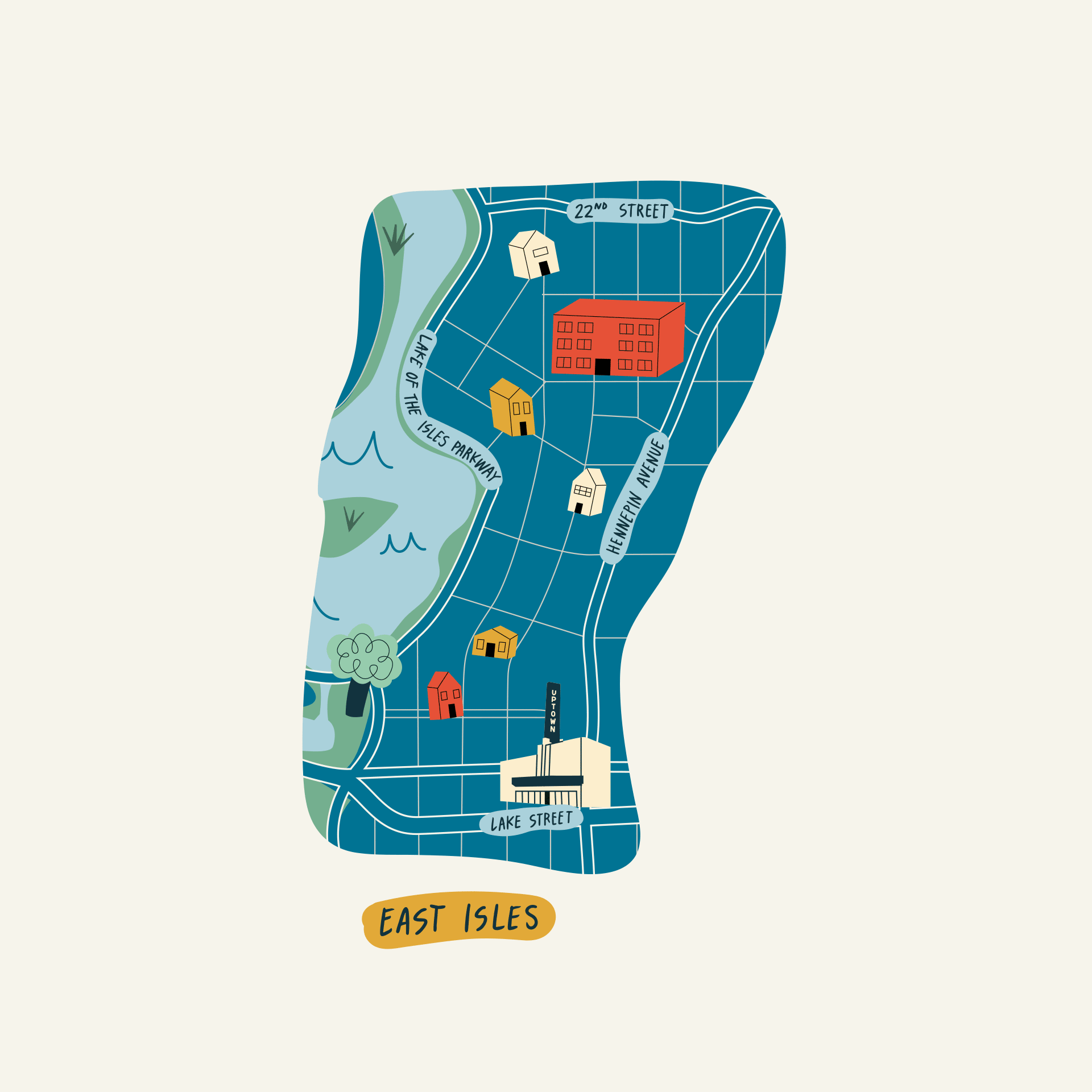 Spanning the winding, eastern edge of Lake of the Isles—one of the northernmost links in the city’s chain of lakes—East Isles is a lush, green neighborhood primarily known for its tree-lined streets, many historic homes, and densely situated restaurants and shops. Many residents describe East Isles as the quintessential Minneapolis community. In the span of just a few blocks, the neighborhood contains many of the city’s best-known features: a lake, a regional park, multiple local grocery stores, easy access to public transportation, and an engaged and close-knit community of neighbors. It is also a site of conflicting storytelling, where stereotypes of ivory tower wealth meet media misconceptions of a desolate and abandoned Uptown. A neighborhood of possibility and contradiction, seated where the lake meets the city, the real story of East Isles lives in the complicated middle. Along Lake Street and Hennepin, new businesses and public art are filling in once-vacant storefronts, and the Midtown Greenway brings pedestrians and bikers from across the city to the neighborhood. The parks and boardwalks along Lake of the Isles hum with activity all year long: picnic blankets dotting the grass in summers; hammocks catching the changing leaves in the fall; neighbors braving a polar plunge in winter, their laughter louder than the cracking ice; runners looping the lake at sunrise in the spring, their headlamps spinning across the lake like fireflies in the dim morning light. On weekends, the line at Isles Bun and Coffee stretches down the block—a mix of new visitors drawn by the promise of the nation’s best cinnamon roll, and East Isles regulars running into their neighbors as they pick up a box of the cafe’s scones (the order—and sign—of a local in the know). It is the kind of community gathering that is a testament to the magic of East Isles: a neighborhood large enough for new discoveries, and small enough for serendipity.